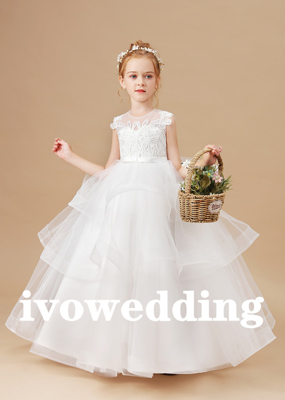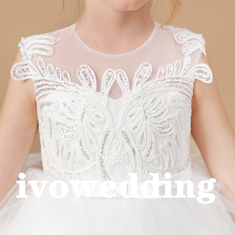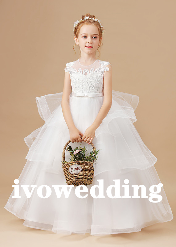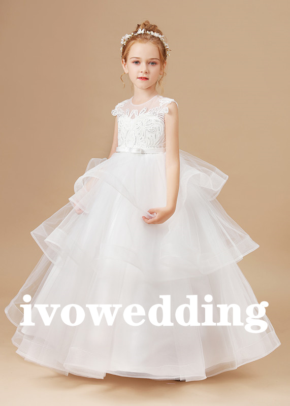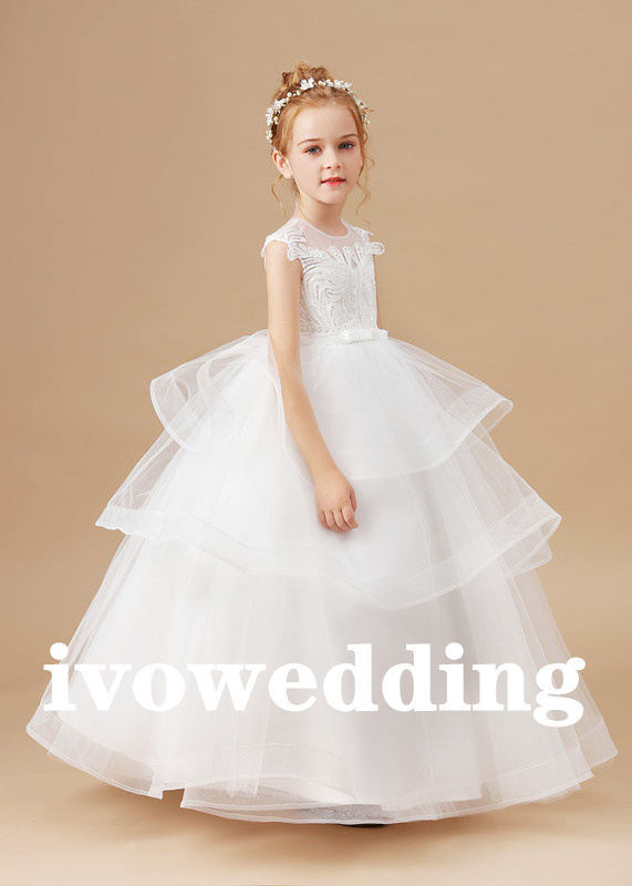 Flower Girl Dress,Girls White Wedding Children Clothing Princess Sleeveless Dresses Baby Kids Birthday Party Clothes Appliques Tiered Dress